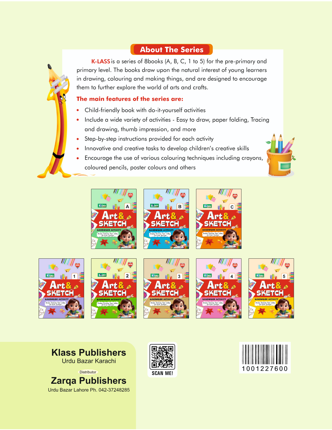 The K-LASS Art & Sketch Series (A, B, C, 1–5) is designed to spark imagination and creativity in young learners. Each book encourages children to explore art through fun, hands-on activities — drawing, colouring, paper folding, tracing, and more.