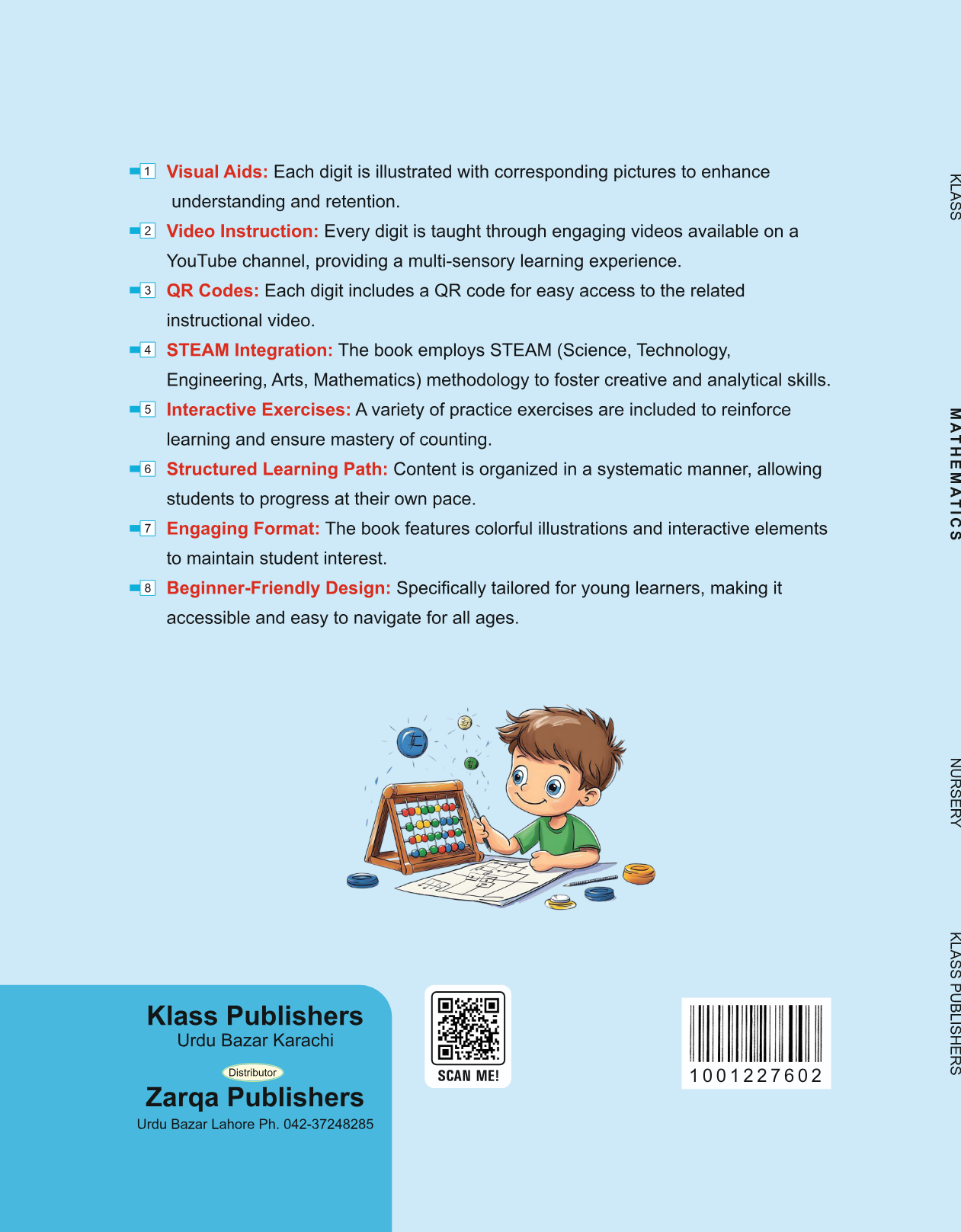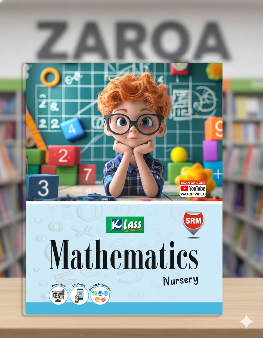 The K-LASS Mathematics Nursery book, jointly published by Klass Publishers and Zarqa Publishers, introduces young learners to the exciting world of numbers through fun, colorful, and interactive learning.